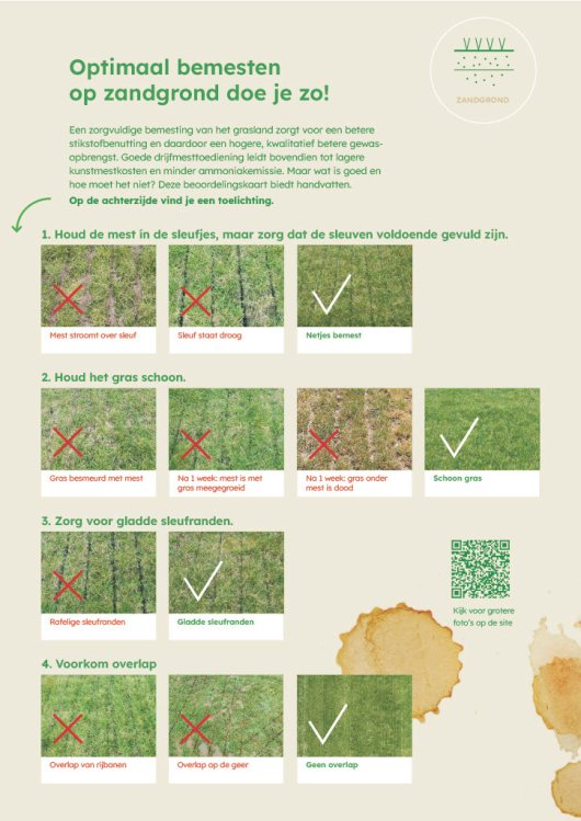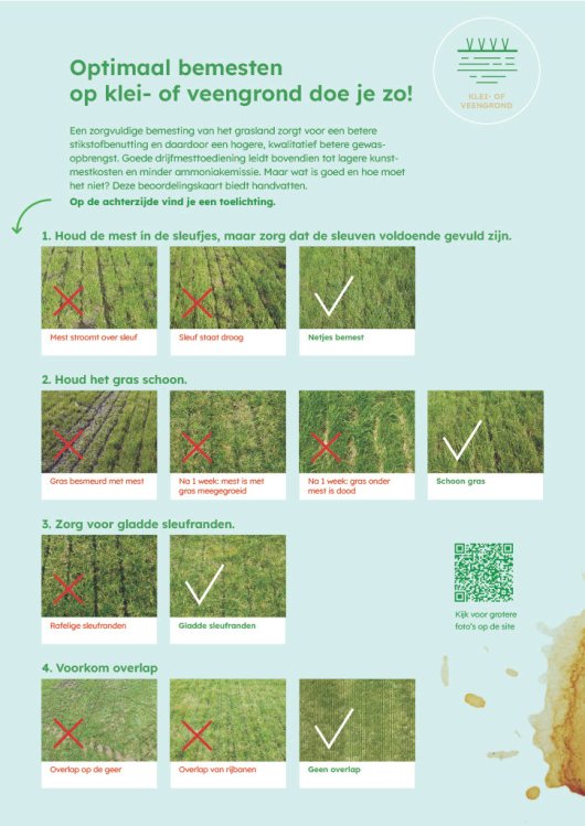 Deze fotokaarten met voorbeelden laten in één oogopslag zien hoe het wél en juist níet moet. Op de achterzijde vind je handige tips voor een optimale bemesting. Download ze hier en ga het gesprek met elkaar aan. Dan genieten boer en loonwerker straks van een mooi werkresultaat en een hogere grasopbrengst.