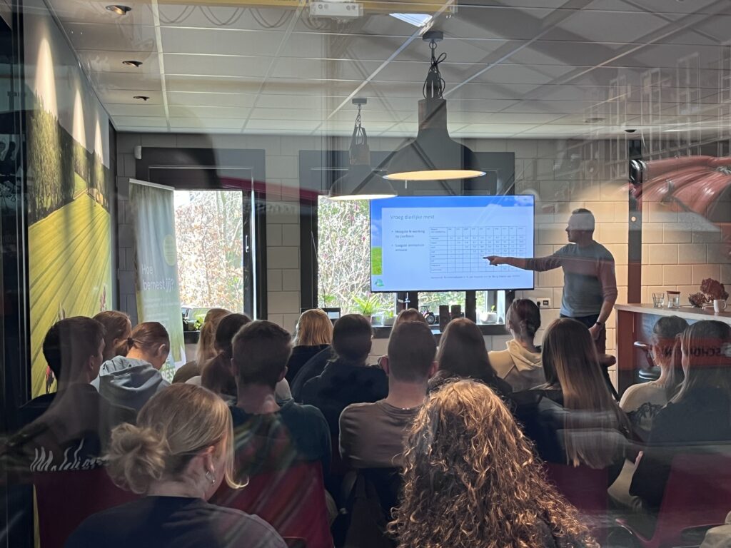 Onze collega Geert Stevens gaf uitleg over onder meer stikstof en emissie, de verschillende plekken op een melkveebedrijf waar stikstofuitstoot gereduceerd kan worden en tips om goed te bemesten. Tijdens deze gastles stelden de studenten kritische vragen en ontstonden interessante discussies.