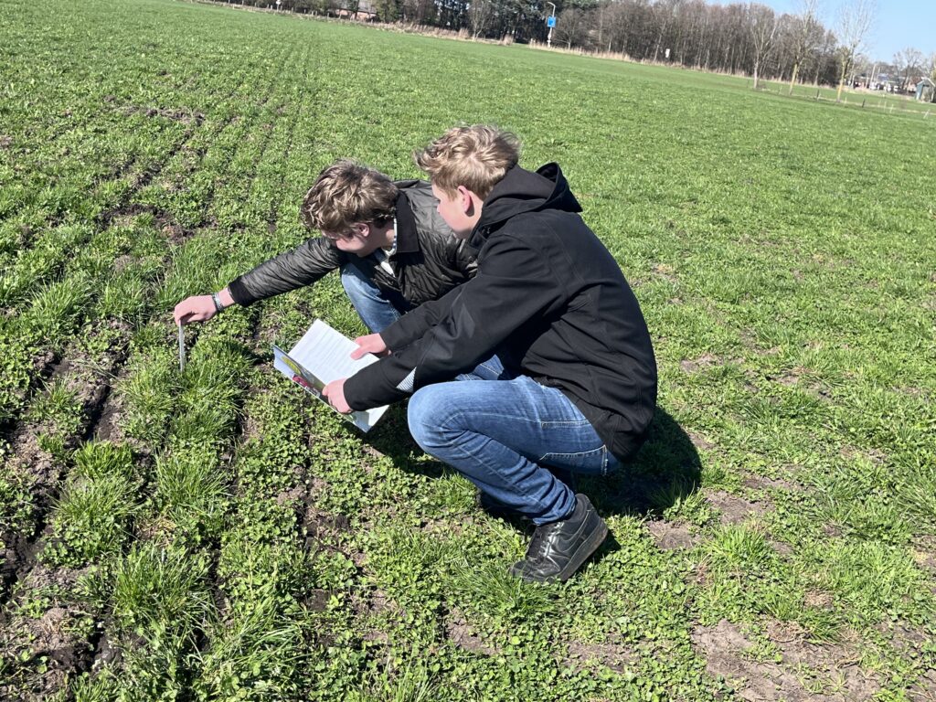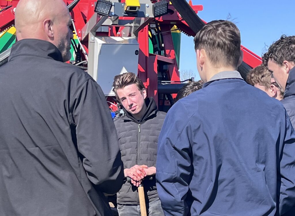 De studenten zitten in het tweede jaar van de opleiding Melkveehouder van Yuverta in Horst en Boxtel. Ze hebben op woensdag vaak praktijkdag en deze keer was het thema ‘grasland en bemesten’. Wij mochten iets komen vertellen bij Van Helmond in Ommel dat zowel een melkveebedrijf als een loonwerker is. We geven onze gastlessen graag op locatie omdat we dan ook in het veld kunnen laten zien wat het effect is van verschillende technieken.