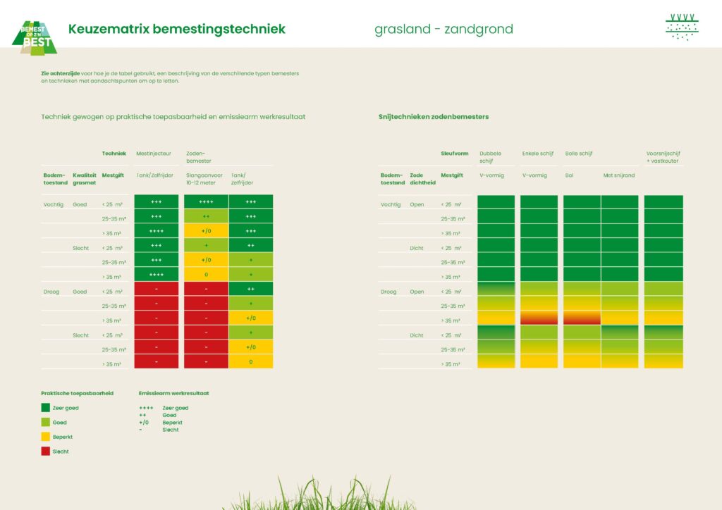Voor de bemesting van grasland of bouwland zijn verschillende bemesters en technieken beschikbaar. Met deze keuzematrix van Bemest op z’n Best kies je de techniek die het best praktisch toepasbaar is en het beste, emissiearme werkresultaat geeft onder verschillende omstandigheden. Zo behoud je zo veel mogelijk stikstof voor het gras, voldoe je aan de wetgeving en belast je het milieu zo min mogelijk.